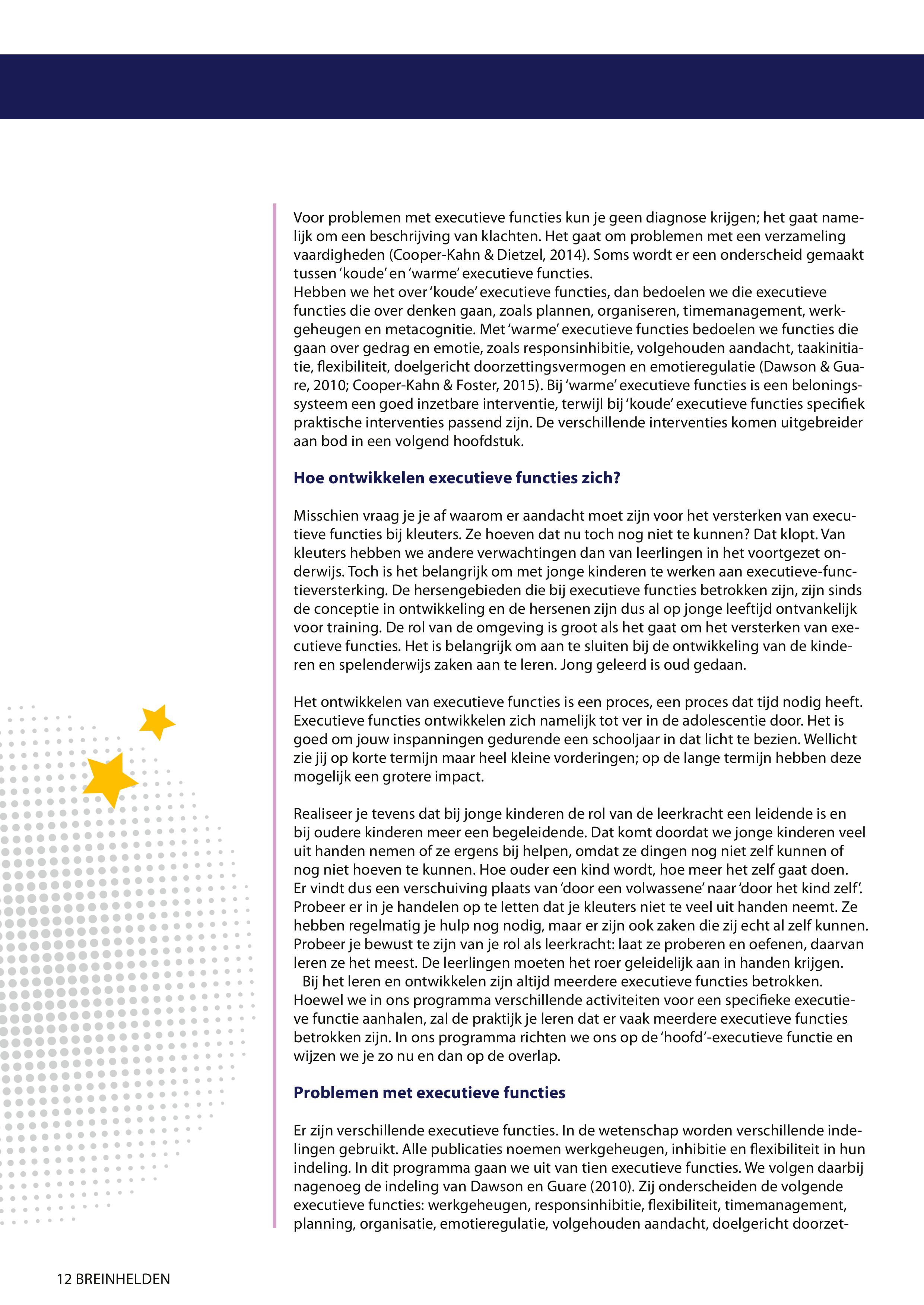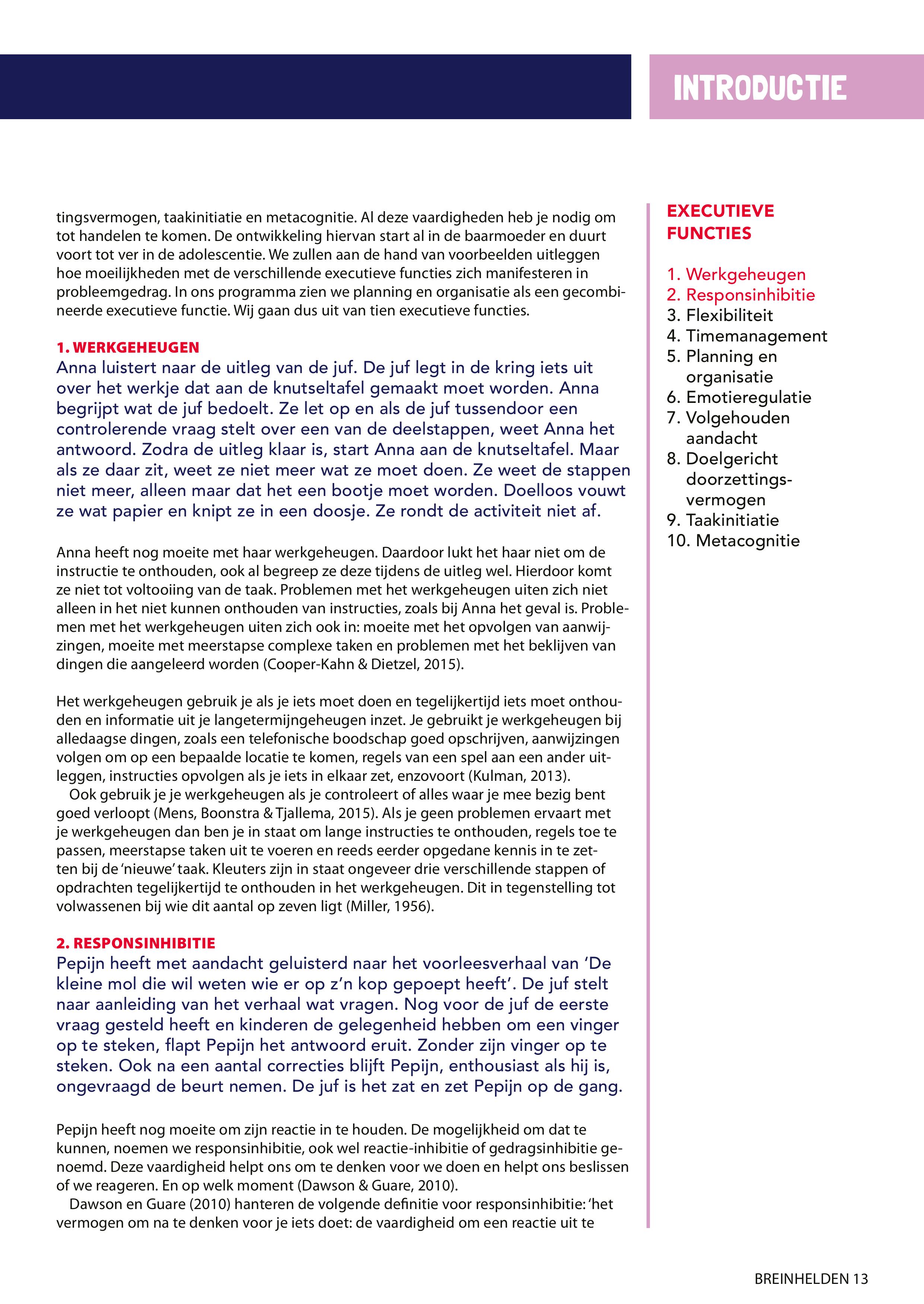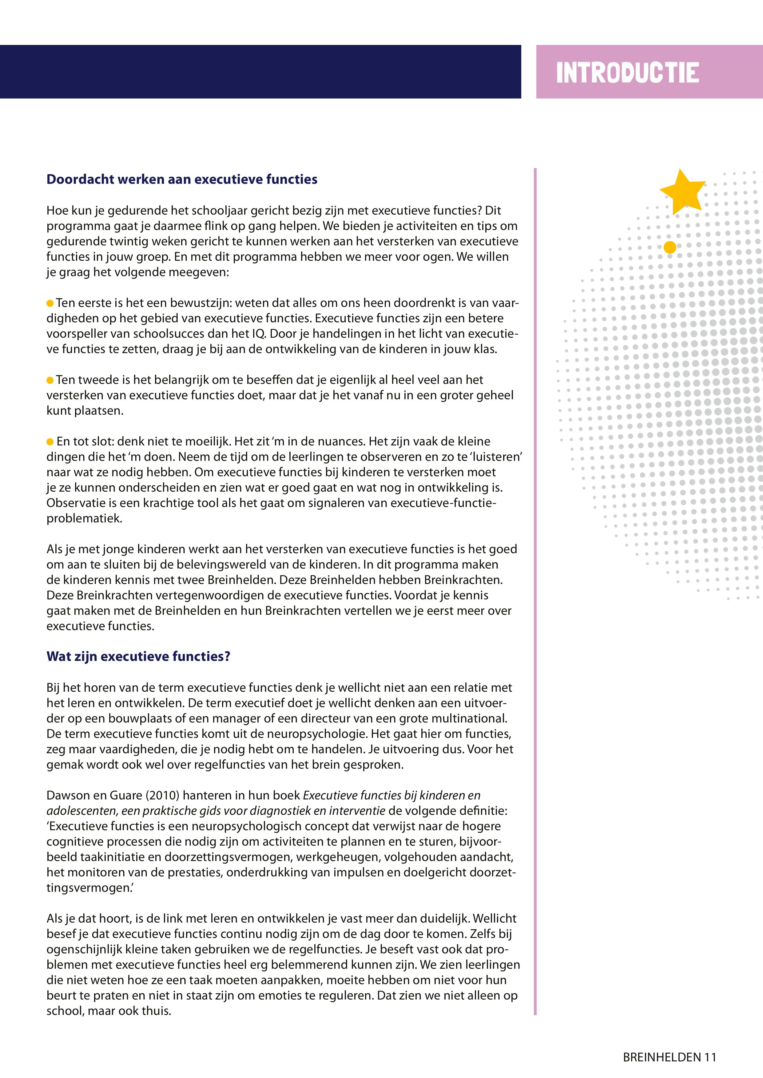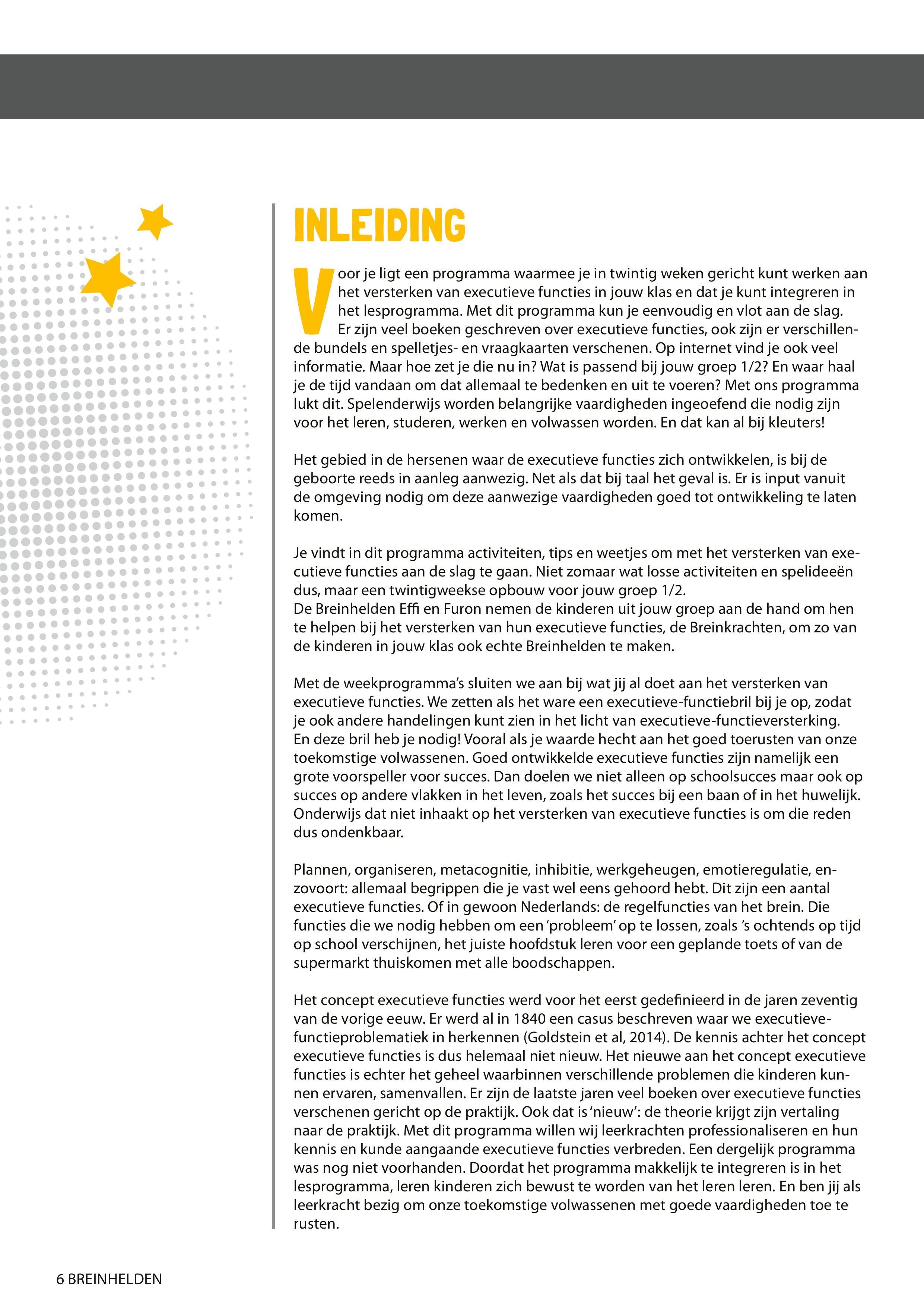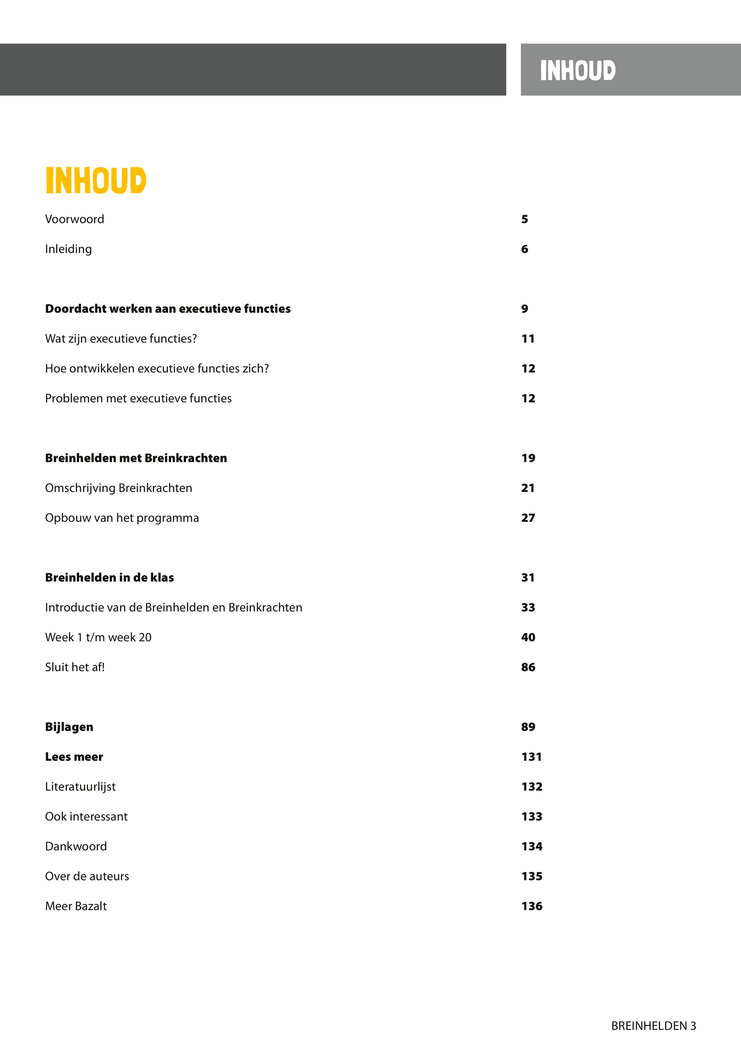 Breinhelden is een programma van twintig weken, waarmee je in je groep doordacht gaat werken aan executieve functies. De executieve functies zijn vertaald naar tien Breinkrachten. Bij iedere kracht vind je speelse activiteiten en tips om die functie te versterken. De auteurs geven je daarnaast inzicht in de theorie achter executieve functies.