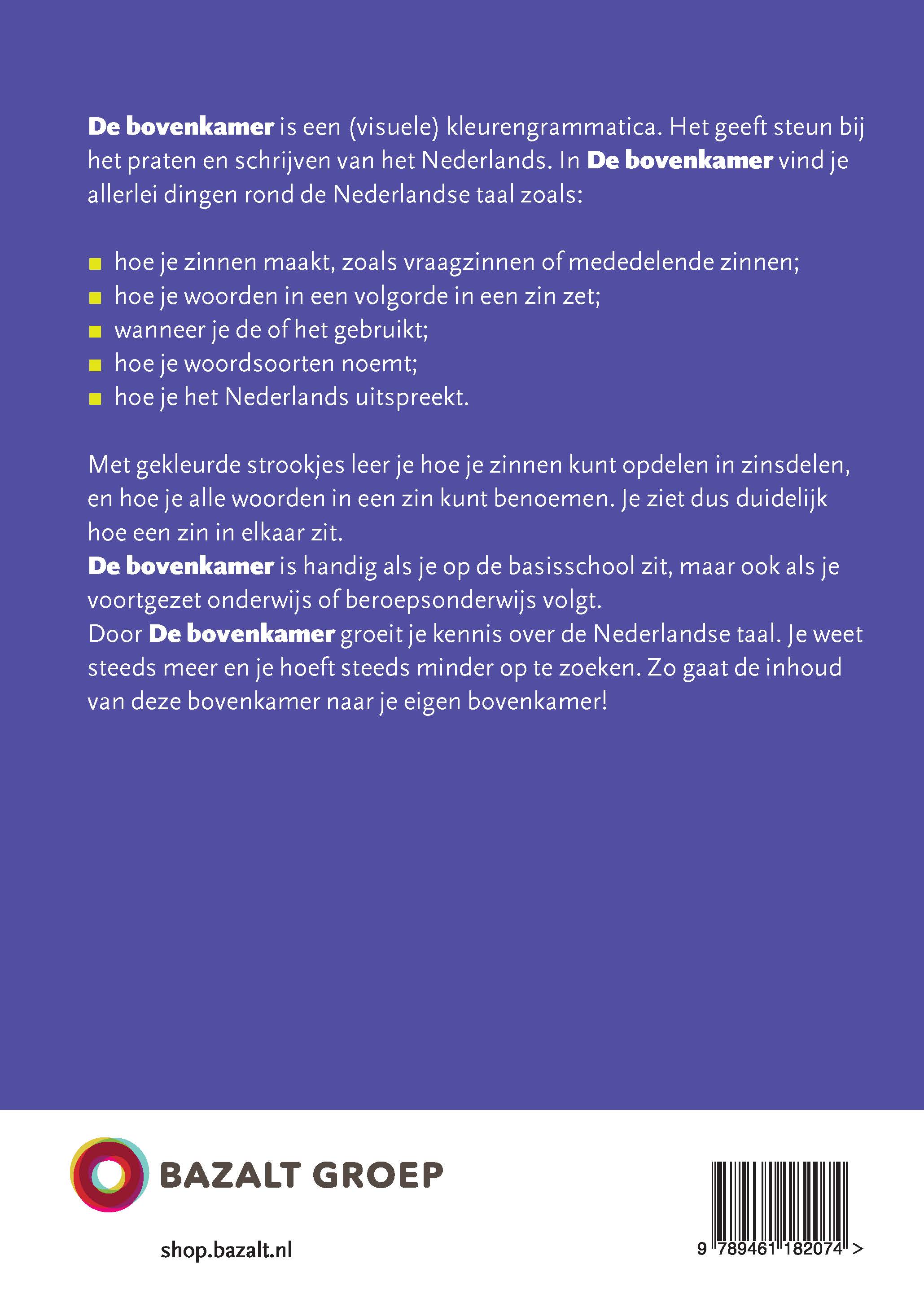De bovenkamer is een opzoekboek voor leerlingen vanaf 8 jaar. Het legt de grammatica uit met behulp van foto’s, symbolen en kleuren. De visuele uitleg is een handige steun in de rug voor iedere leerling, maar zeker voor leerlingen die het Nederlands niet als moedertaal hebben. Voor hen zijn ‘vanzelfsprekendheden’ in de taal immers niet zo vanzelfsprekend.