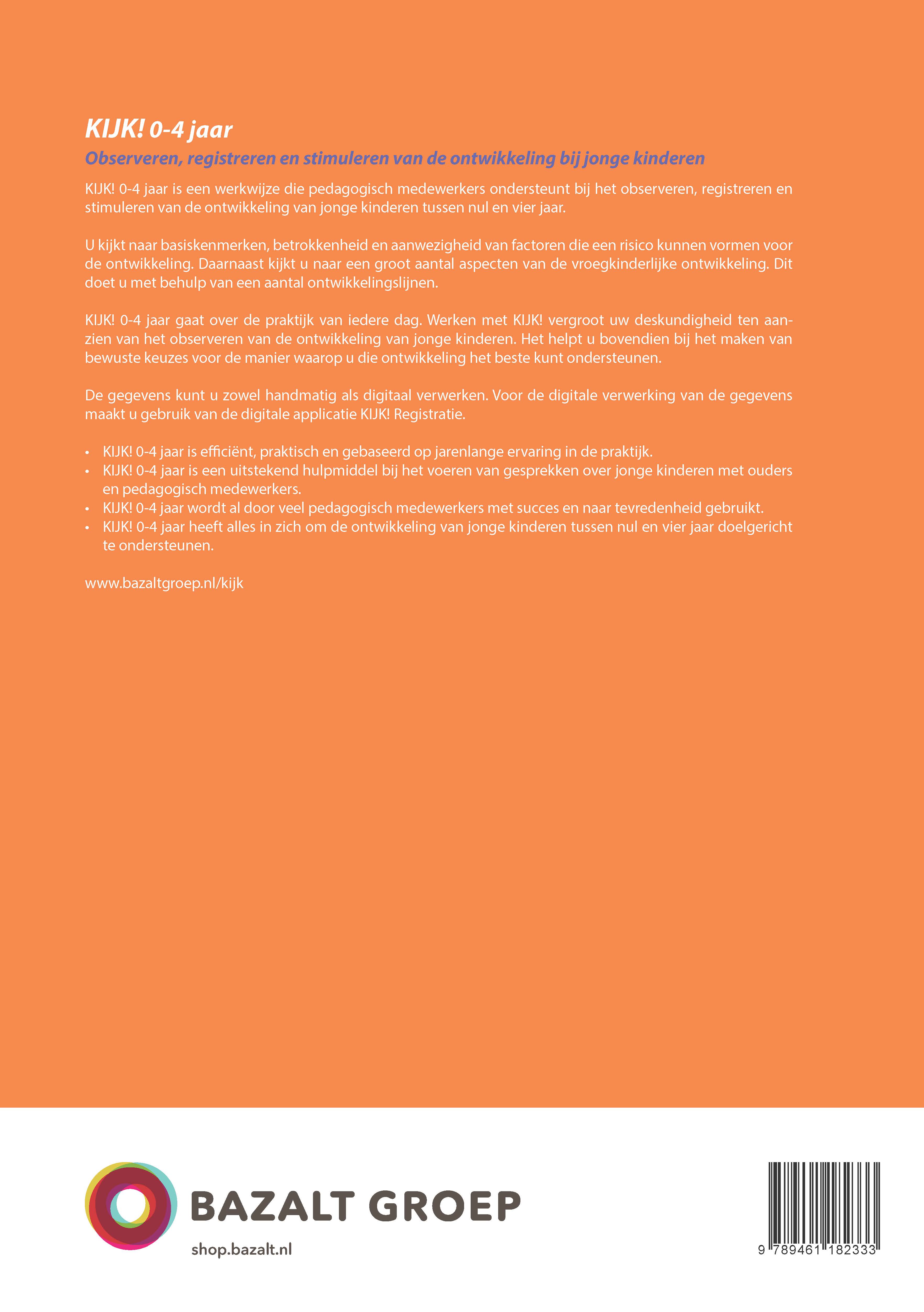 KIJK! 0-4 jaar gaat over de praktijk van iedere dag. Werken met KIJK! vergroot jouw deskundigheid ten aanzien van het observeren van de ontwikkeling van jonge kinderen. Het helpt je bovendien bij het maken van bewuste keuzes voor de manier waarop je die ontwikkeling het beste kunt ondersteunen.