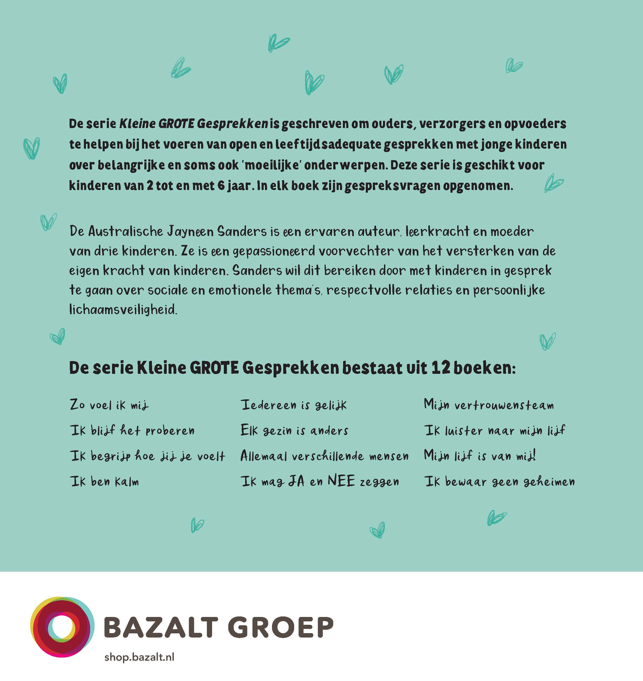 Dit boek maakt deel uit van de serie Kleine GROTE Gesprekken. Deze serie is geschreven om ouders, verzorgers en opvoeders te helpen bij het voeren van open en leeftijdsadequate gesprekken met jonge kinderen over belangrijke en soms ook ‘moeilijke’ onderwerpen. Geschikt voor kinderen van 2 tot en met 8 jaar en een waardevolle aanvulling op de opvoeding thuis, op school of in de kinderopvang. In elk boek zijn gespreksvragen opgenomen.