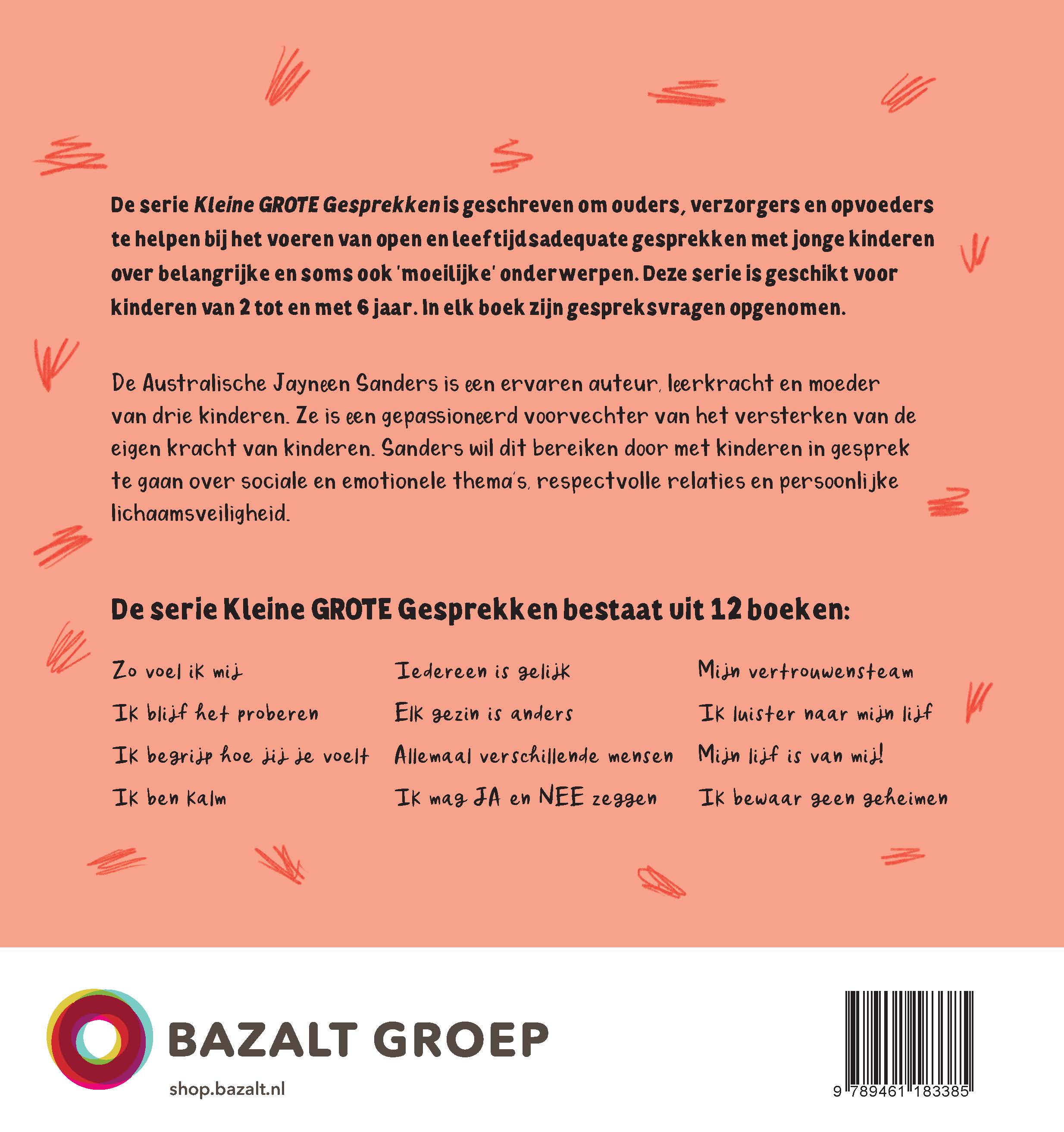 Ik mag JA en NEE zeggen is een introductie tot de begrippen toestemming en lichaamsgrenzen. Het leren over lichaamsgrenzen en hoe kinderen deze kunnen aangeven, is essentieel voor het groeiende zelfbeeld, zelfvertrouwen en de manier waarop ze mogen verwachten door anderen behandeld te worden. Dit boek maakt deel uit van de serie Kleine GROTE Gesprekken.