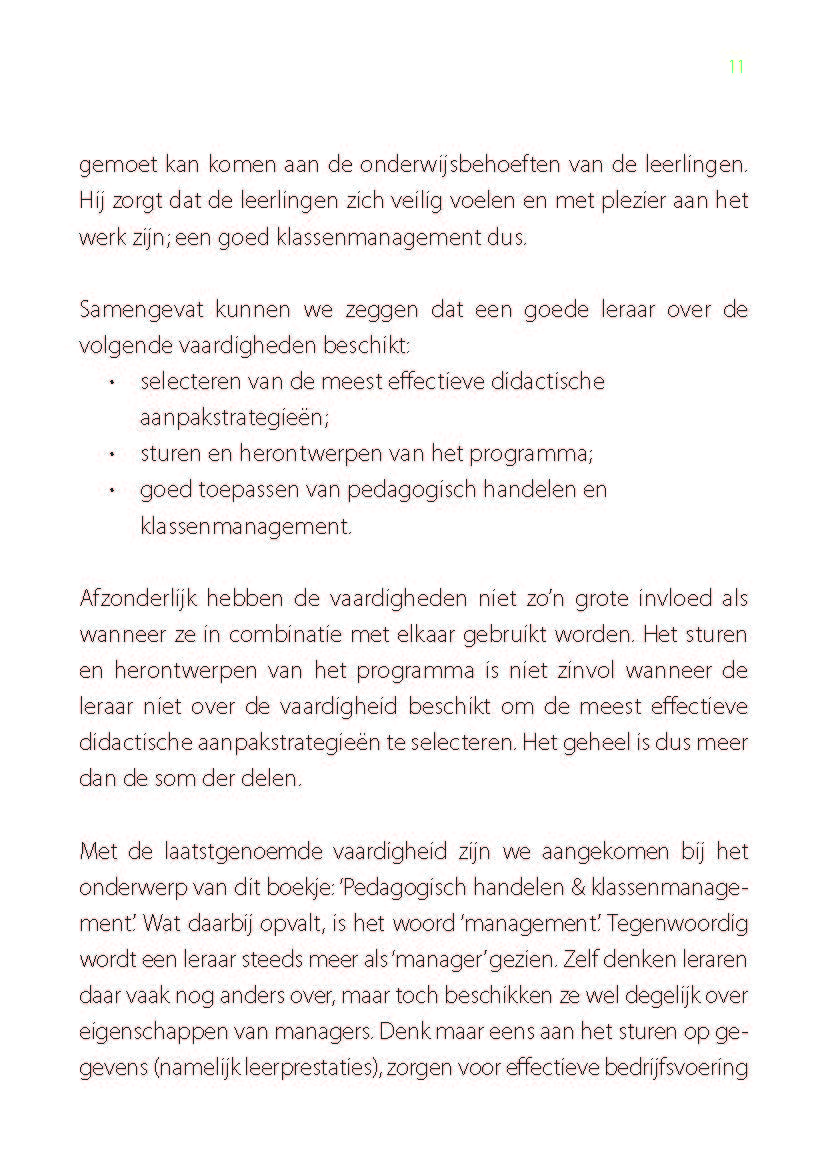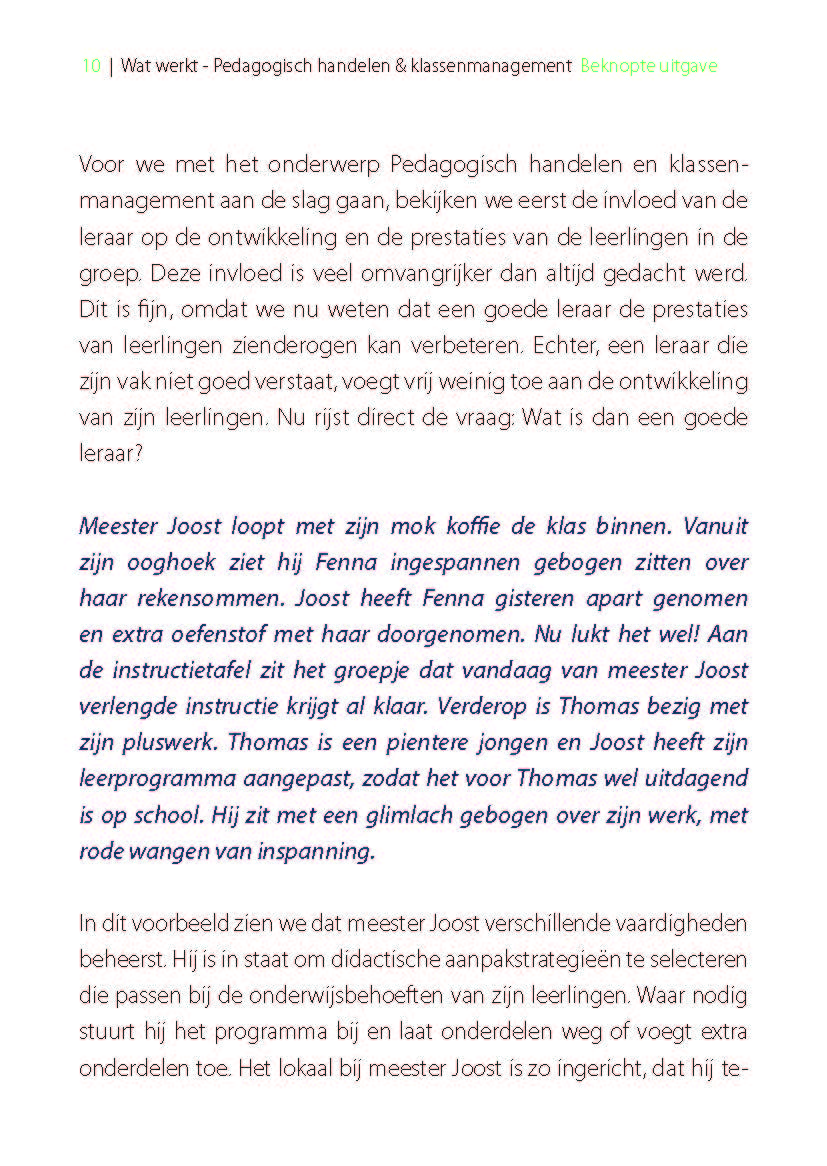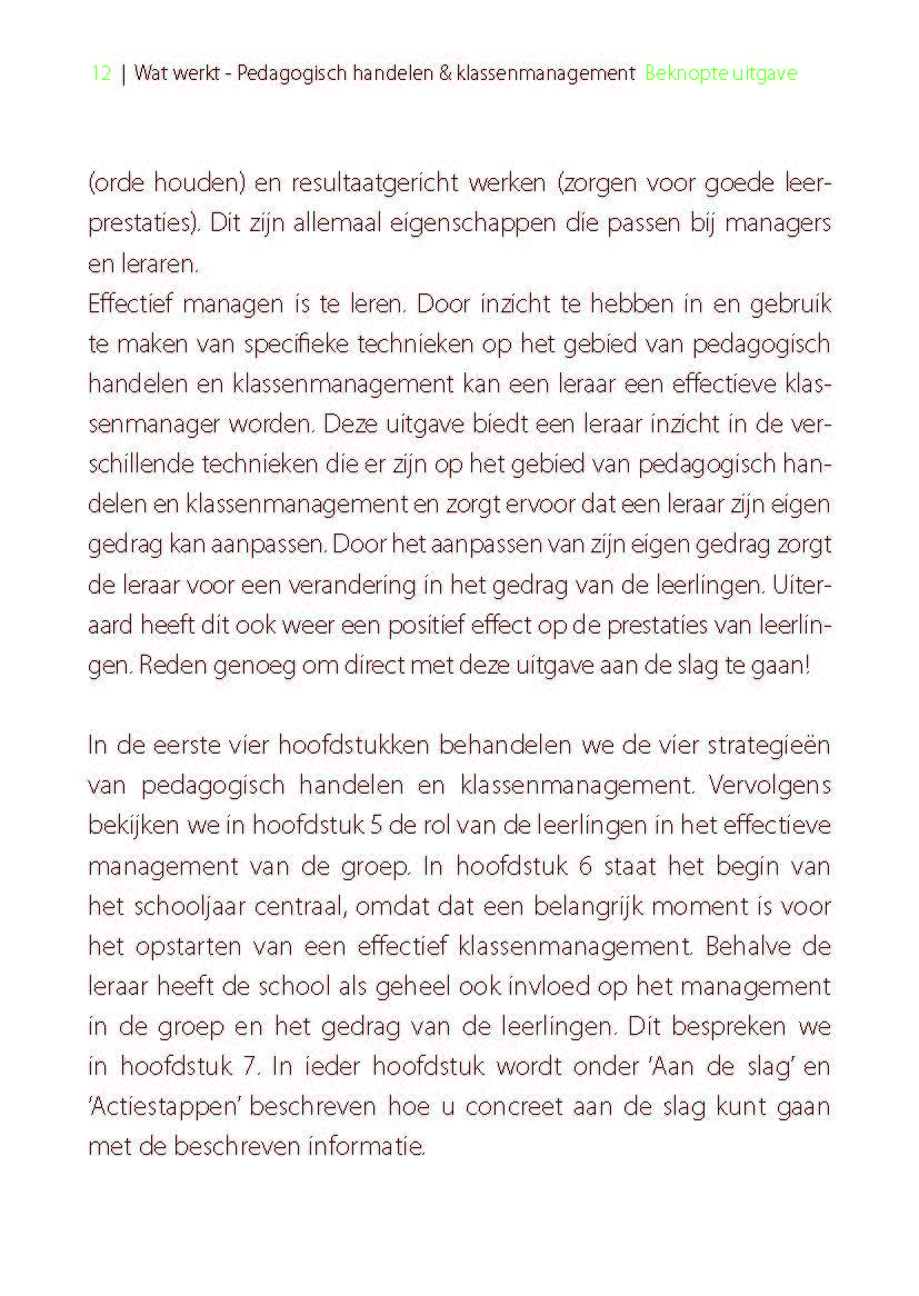Dit boekje is een beknopte uitgave van ‘Wat werkt: Pedagogisch handelen & klassenmanagement en geeft een samenvatting van de essentiële informatie uit dit boek. Het beschrijft 4 fundamentele strategieën voor pedagogisch handelen en klassenmanagement waarmee je het effectief managen van een klas in de vingers kunt krijgen. Met deze beknopte uitgave maak je hier op een efficiënte manier kennis mee.