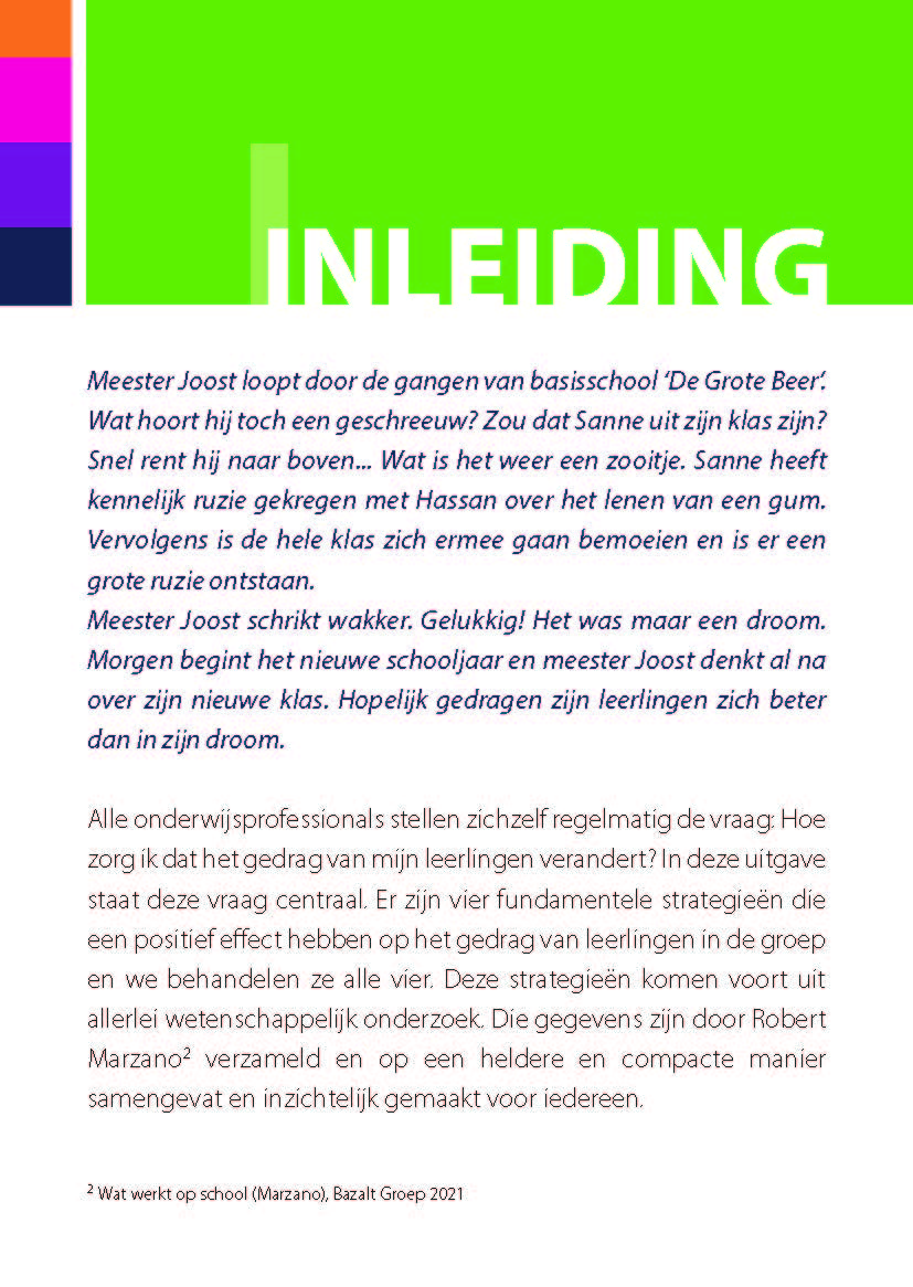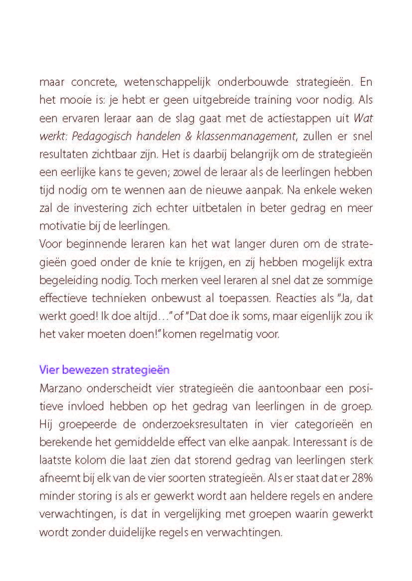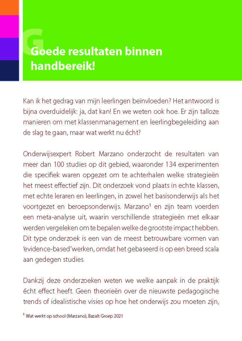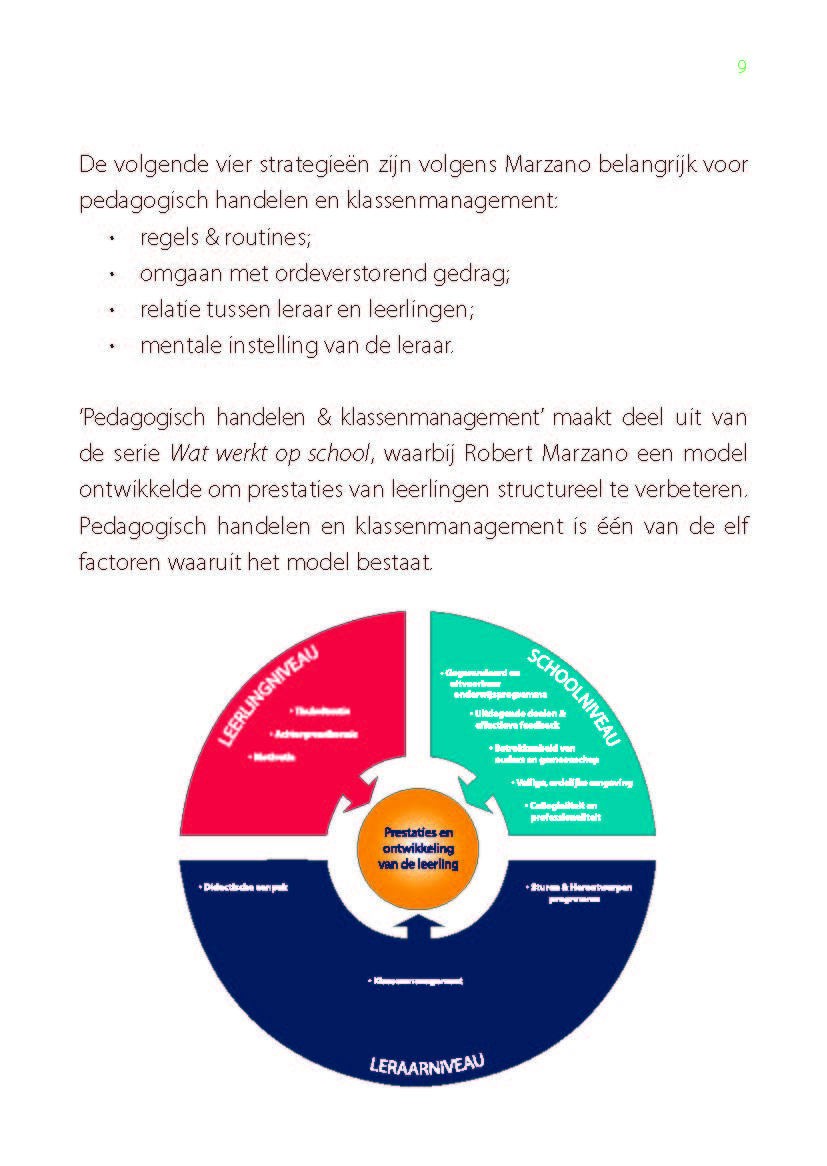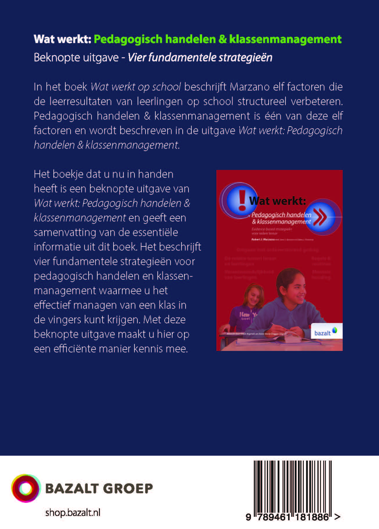 In het boek ‘Wat werkt op school’ beschrijft Robert Marzano 11 factoren die de leerresultaten van leerlingen op school structureel verbeteren. Pedagogisch handelen & klassenmanagement is één van deze elf factoren en wordt beschreven in de uitgave Wat werkt: Pedagogisch handelen & klassenmanagement.