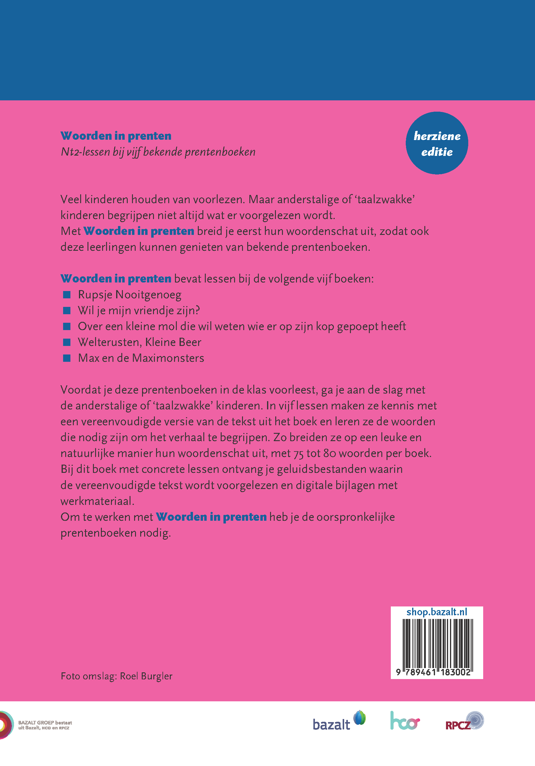 * Dit is de herziene versie van Woorden in prenten. De uitgave is geactualiseerd. De vorige editie bestond uit twee boeken waarin lessen stonden bij in totaal 10 prentenboeken. Omdat deze prentenboeken niet allemaal meer verkrijgbaar zijn, is Woorden in prenten teruggebracht tot 1 boek, met woordenschatlessen bij 5 prentenboeken.