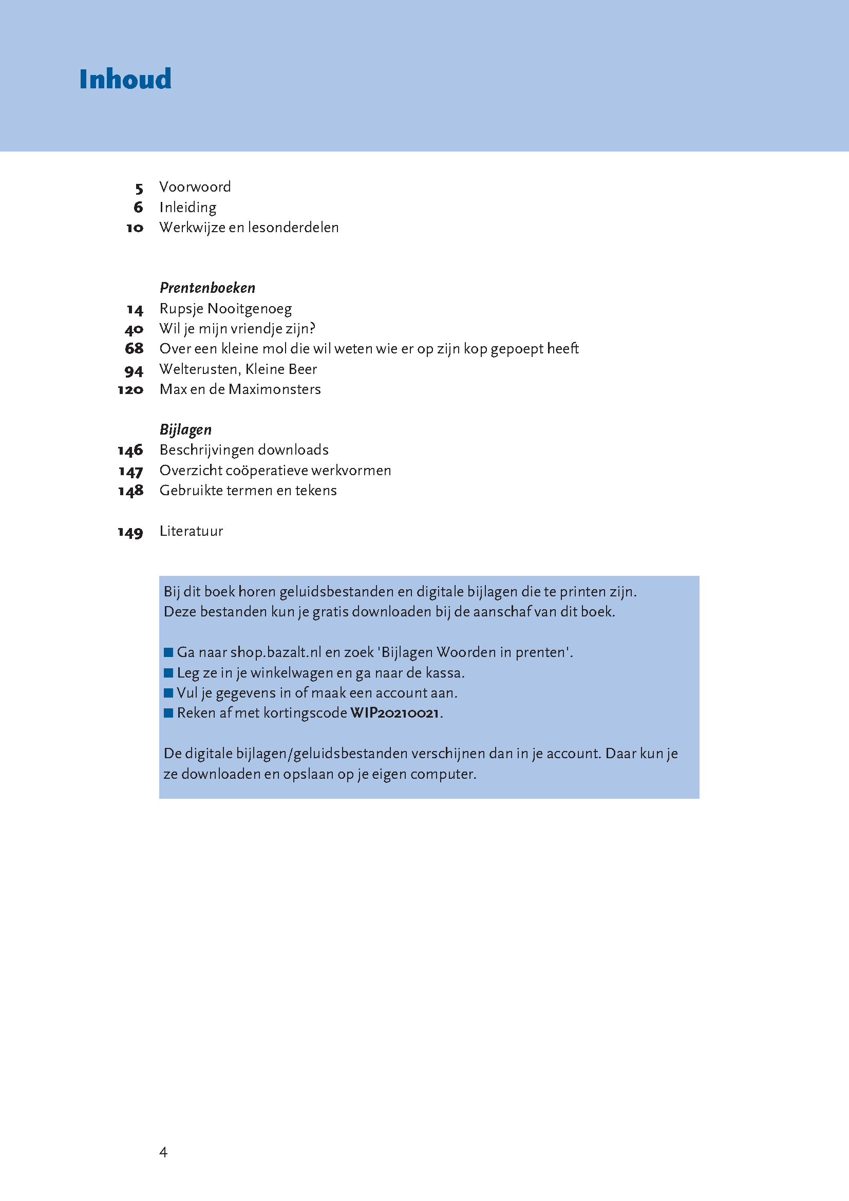Heb je Woorden in prenten elders aangeschaft? Dan kun je de losse digitale bijlagen gratis downloaden in onze shop met de code uit de map. Klik hier voor de losse digitale bijlage.